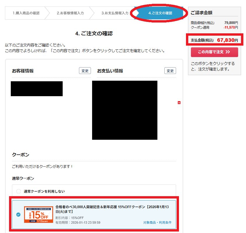 購入手続きを進め、「4.ご注文の確認」まで行くと10%OFFクーポンを利用できます。