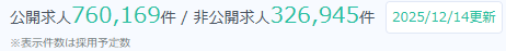 2025年12月14日現在、「公開求人約76万件」「非公開求人約32万件」の求人数を誇っています。